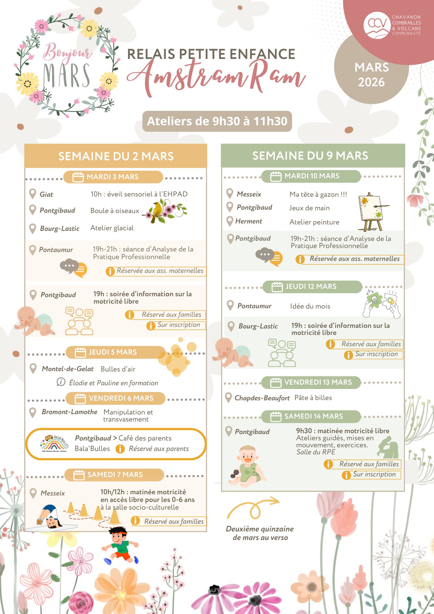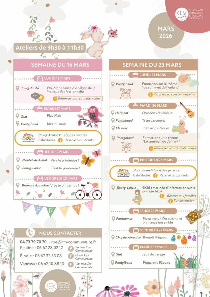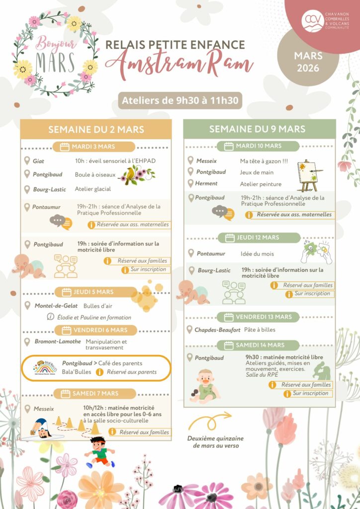C’est bientôt le Printemps ! Le vent d’hiver laisse doucement place aux premières floraisons … Pour préparer l’arrivée de cette nouvelle saison, l‘équipe du RPE Amstram’Ram vous attend nombreux à ses activités organisées sur tout le territoire !