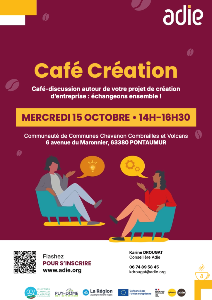 Mercredi 15 octobre : café création d’entreprise Café-discussion autour de notre projet de création d’entreprise Mercredi 15 octobre 14h-16h30 Communauté de communes - 6 av. du Marronnier - 63380 Pontaumur Porteurs de projet Gratuit Sur inscription auprès de Karine Drougat au 06 74 89 58 45 Echange autour de la création d'entreprise animé par l'ADIE 04 73 79 70 70 Service economie economie(@)ccvcommunaute.fr Tweet Share 0 Reddit +1 Pocket LinkedIn 0 Jeudi 16 octobre : soirée des associations à Prondines Mercredi 15 octobre : Micro-Folie Pontgibaud